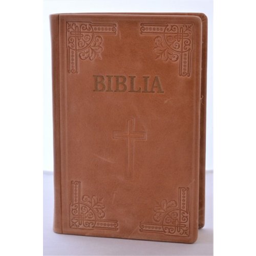 Biblia din piele, handmade, marime mare, maro deschis, margini aurii, simbol cruce, cuv. lui Isus cu rosu [073 HM]