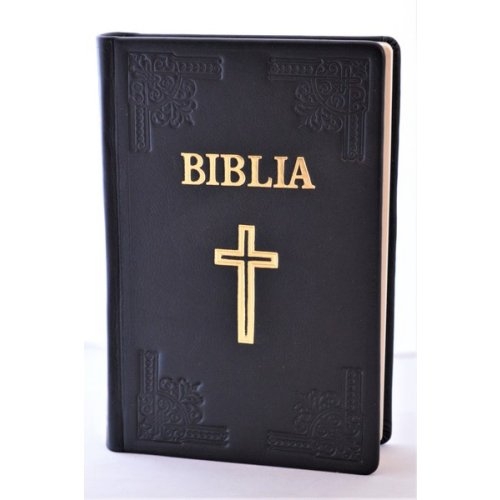 Biblia din piele, handmade, marime mare, negru, margini aurii, simbol cruce, cuv. lui Isus cu rosu [073 HM]