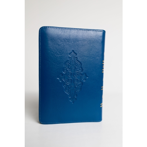 Biblia din piele, handmade, marime medie, culoare albastru, fermoar, simbol maini in rugaciune, margini aurii cu index, cuv. lui Isus cu rosu [057 HM]