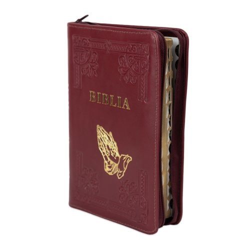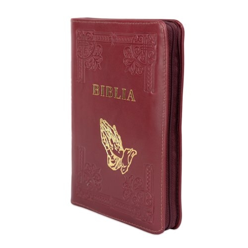 Biblia din piele, handmade, marime medie, culoare bordo, fermoar, simbol maini in rugaciune, margini aurii cu index, cuv. lui Isus cu rosu [057 HM]
