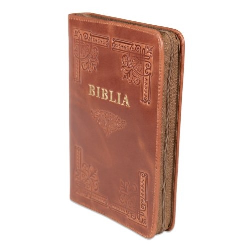 Biblia din piele, handmade, marime medie, culoare maro,fermoar, margini aurii cu index, cuv. lui Isus cu rosu [057 HM]