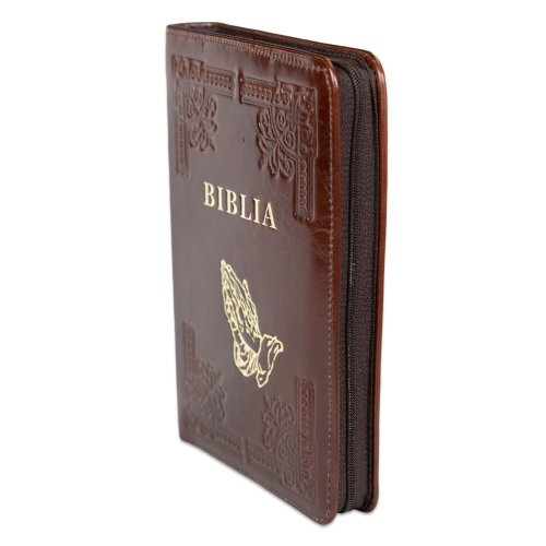 Biblia din piele, handmade, marime medie, culoare maro ,fermoar, simbol maini in rugaciune, margini aurii cu index, cuv. lui Isus cu rosu [057 HM]