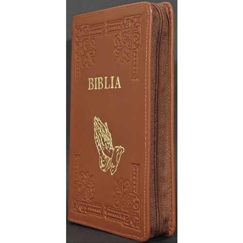 Biblia din piele, handmade, marime medie, culoare maro, margini aurii cu index,fermoar, simbol maini in rugaciune, cuv. lui Isus cu rosu [057 HM]