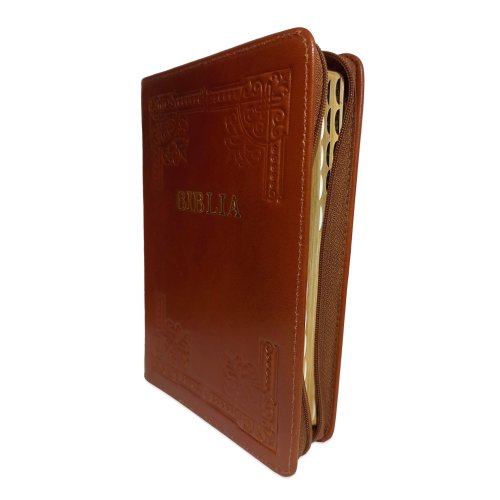 Biblia din piele, handmade, marime medie, culoare maro roscat, margini aurii cu index,fermoar, cuv. lui Isus cu rosu [057 HM]