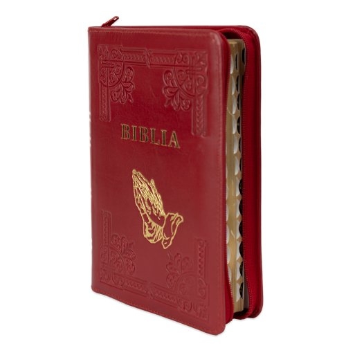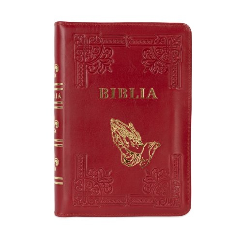 Biblia din piele, handmade, marime medie, culoare rosu închis , fermoar, simbol maini in rugaciune, margini aurii cu index, cuv. lui Isus cu rosu [057 HM]