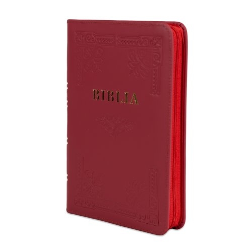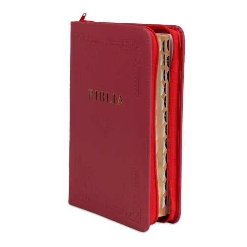 Biblia din piele, handmade, marime medie, culoare roz inchis, fermoar,margini aurii cu index, cuv. lui Isus cu rosu [057 HM]