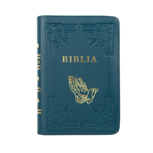 Biblia din piele, handmade, marime medie, culoare verde turcoaz închis, fermoar, simbol maini in rugaciune, margini aurii cu index, cuv. lui Isus cu rosu [057 HM]