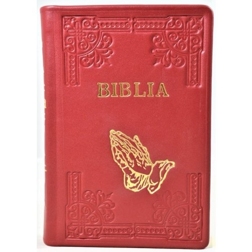 Biblia din piele, handmade, marime medie, rosie, margini aurii, index, simbol maini, cuv. lui Isus cu rosu [052 HMI]