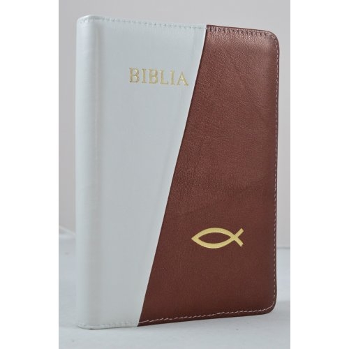 Biblia din piele, marime medie, alb cu caramiziu sidefat , fermoar, simbol peste, cuv. lui Isus cu rosu [053]