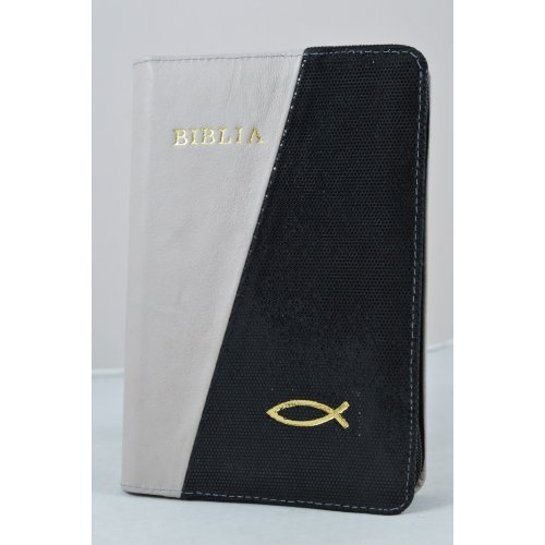 Biblia din piele, marime medie, alb cu negru lucios texturat, fermoar, simbol peste, cuv. lui Isus cu rosu [053]