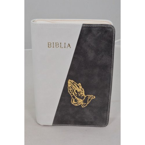 Biblia din piele, marime medie, alb/gri, fermoar, simbol maini in ruga, cuv. lui Isus cu rosu [053]