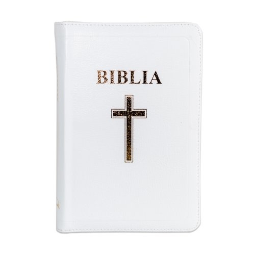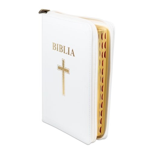 Biblia din piele, marime medie, alba, fermoar, index, margini aurii, hărți biblice, cuv. lui Isus în roșu [057 ZTI]