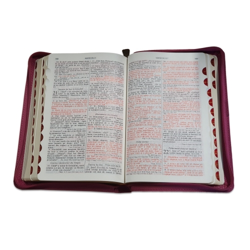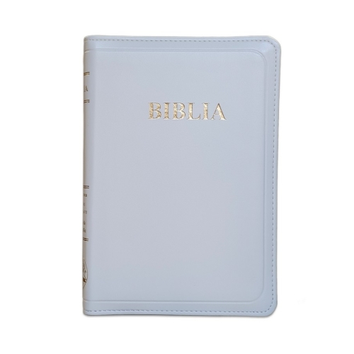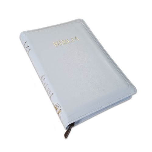 Biblia din piele, marime medie, alba, fermoar, index pe cotor, margini aurii, cuv. lui Isus in rosu [057 ZTI]
