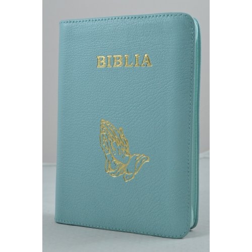 Biblia din piele, marime medie, albastru ciel , fermoar, simbol maini in ruga, cuv. lui Isus cu rosu [053]