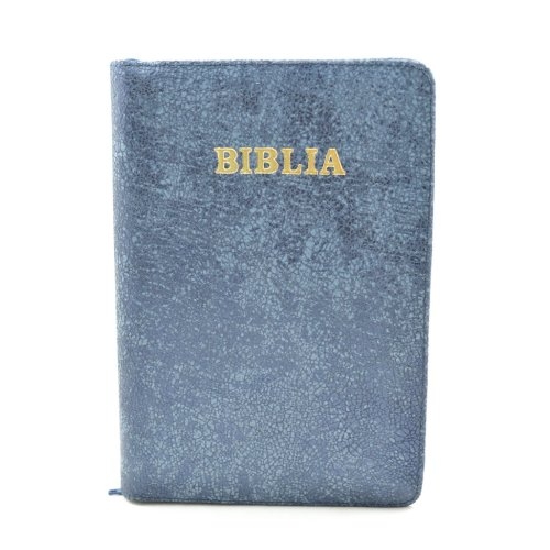 Biblia din piele, marime medie, albastru cu imprimeu, fermoar, cuv. lui Isus cu rosu [053]