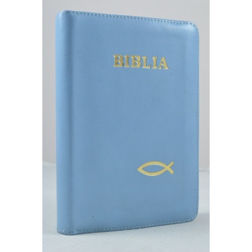 Biblia din piele, marime medie, albastru deschis, fermoar, simbol peste, cuv. lui Isus cu rosu [053]
