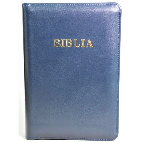 Biblia din piele, marime medie, albastru inchis, fermoar, cuv. lui Isus cu rosu [053]