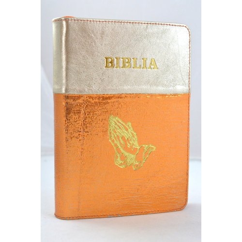 Biblia din piele, marime medie, argintiu - portocaliu, fermoar, simbol maini ruga, cuv. lui Isus cu rosu [053]