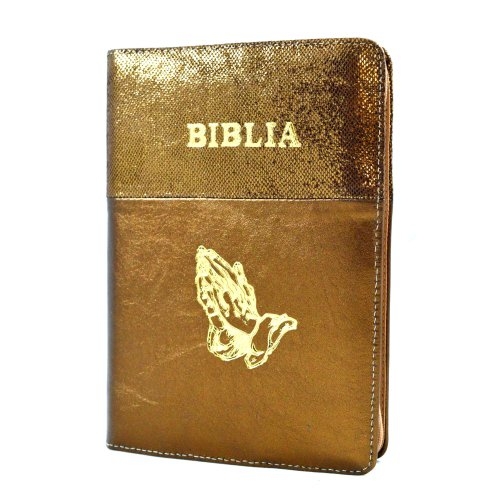 Biblia din piele, marime medie, auriu - bronz, fermoar, simbol maini, cuv. lui Isus cu rosu [053]