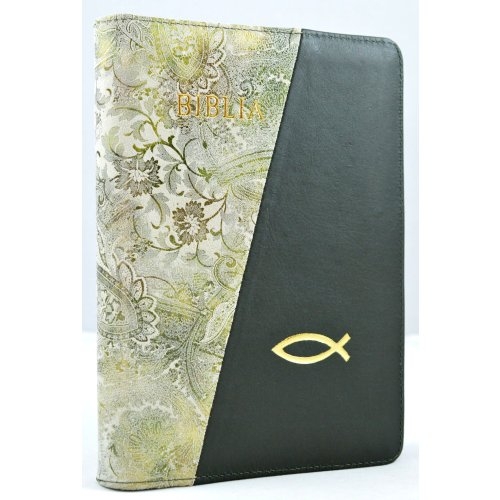 Biblia din piele, marime medie, bej floral / negru, fermoar, simbol peste, cuv. lui Isus cu rosu [053]