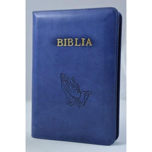 Biblia din piele,marime medie,bleu, fermoar, aurita,cu maini gravate, cuv. lui Isus cu rosu [052]