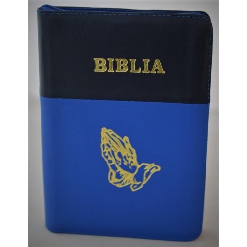 Biblia din piele, marime medie, bleumarin-albastru, fermoar, simbol maini, cuv. lui Isus cu rosu [053]