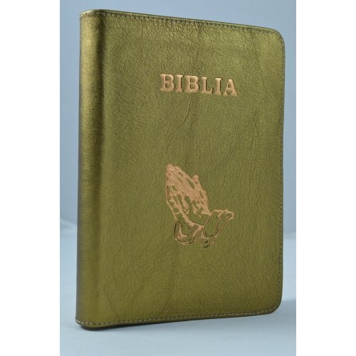 Biblia din piele, marime medie, bronz auriu, cu maini in ruga gravate, fermoar, aurita, cuv. lui Isus cu rosu [052]
