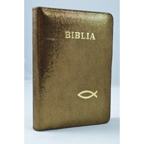 Biblia din piele, marime medie, bronz ,cu peste, fermoar, aurita, cuv. lui Isus cu rosu [052]