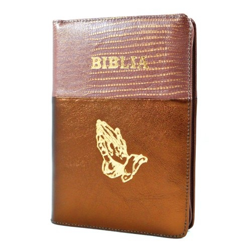 Biblia din piele, marime medie, cafeniu - bronz inchis, fermoar, simbol maini, cuv. lui Isus cu rosu [053]