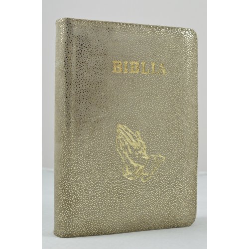 Biblia din piele, marime medie, crem cu imprimeu auriu , fermoar, simbol maini in ruga, cuv. lui Isus cu rosu [053]