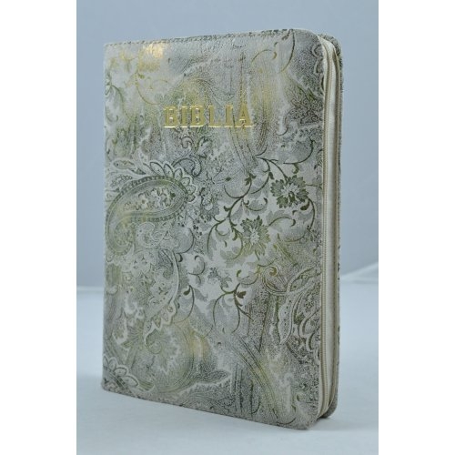 Biblia din piele, marime medie, crem cu imprimeu verde, fermoar, margini aurite,, cuv. lui Isus cu rosu [052]