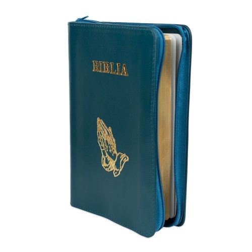Biblia din piele, marime medie, culoare, albastru turcoaz închis, fermoar, margini aurii, simbolul maini in rugaciune, cuv. lui Isus cu rosu [052]