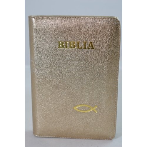 Biblia din piele, marime medie, culoare aurie, fermoar, simbol peste, cuv. lui Isus cu rosu [053]