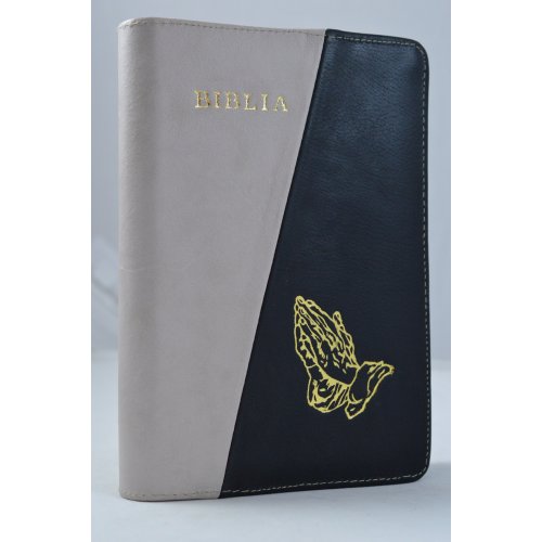 Biblia din piele, marime medie, culoare gri/ negru , fermoar, cu maini in ruga gravate, cuv. lui Isus cu rosu [053