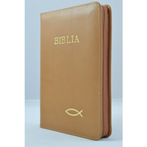 Biblia din piele, marime medie, culoare maro, cu fermoar, cu peste, cuv. lui Isus cu rosu [053]