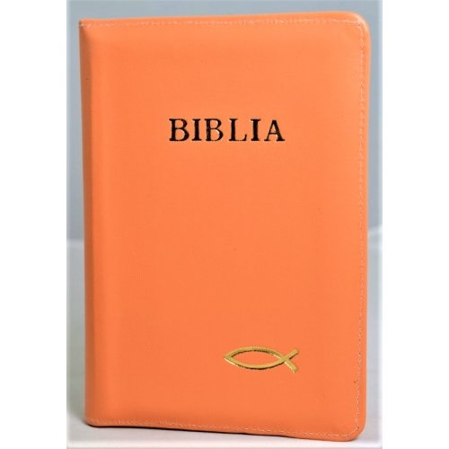Biblia din piele, marime medie, culoare portocaliu deschis, fermoar, simbol peste, cuv. lui Isus cu rosu [053]