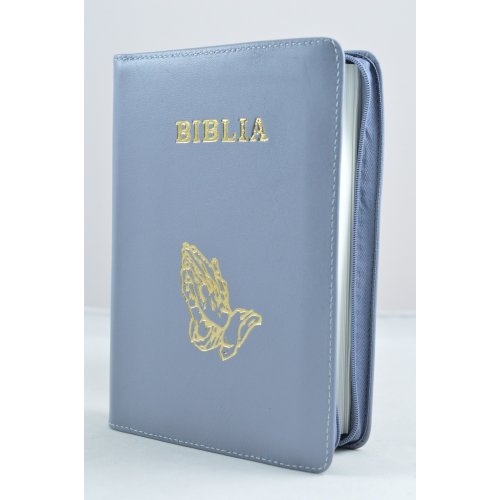 Biblia din piele, marime medie,gri deschis, fermoar, simbol maini în rugă, cuv. lui Isus cu rosu [053]