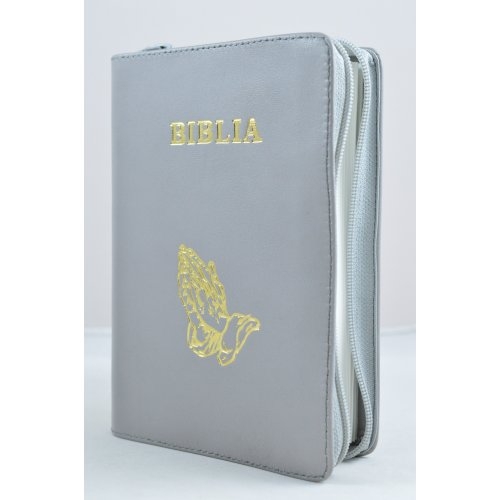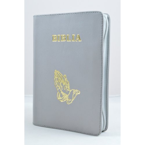 Biblia din piele, marime medie,gri, fermoar, simbol maini în rugă, cuv. lui Isus cu rosu [053]