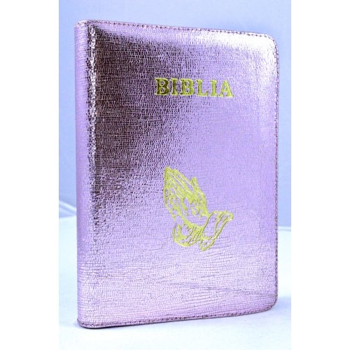 Biblia din piele, marime medie, lila, fermoar, simbol maini, cuv. lui Isus cu rosu [053]