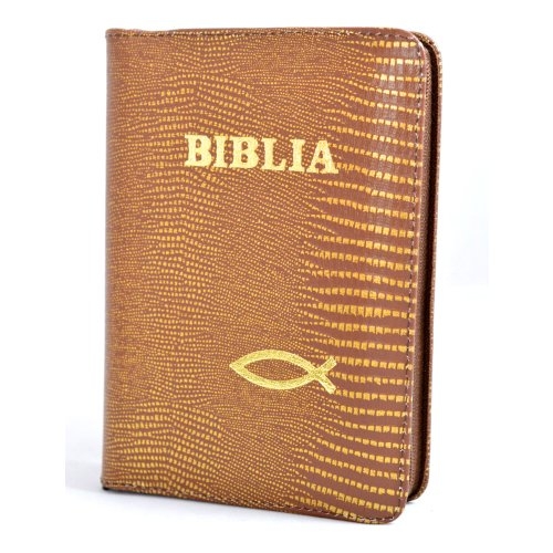 Biblia din piele, marime medie,maro cu imprimeu auriu, fermoar, simbol peste, cuv. lui Isus cu rosu [053]