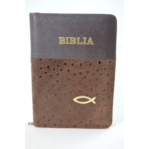 Biblia din piele, marime medie, maro cu maro cu picatele, fermoar, simbol peste, cuv. lui Isus cu rosu [053]