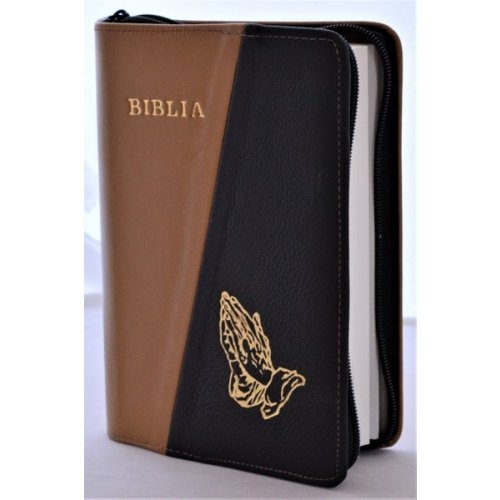 Biblia din piele, marime medie, maro deschis cu negru, fermoar, simbol maini in ruga, cuv. lui Isus cu rosu [053]