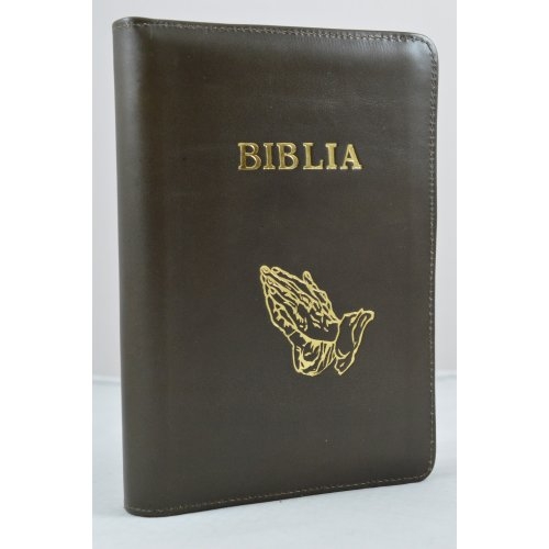 Biblia din piele, marime medie, maro, fermoar, simbol maini in rugaciune, cuv. lui Isus cu rosu [053]