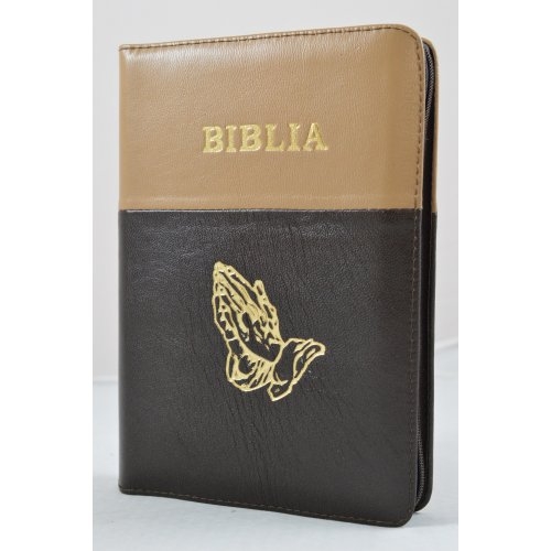 Biblia din piele, marime medie, maro inchis cu cafeniu, fermoar, simbol maini in ruga, cuv. lui Isus cu rosu [053]