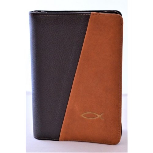 Biblia din piele, marime medie, maro inchis cu maro deschis, fermoar, simbol peste, cuv. lui Isus cu rosu [053]