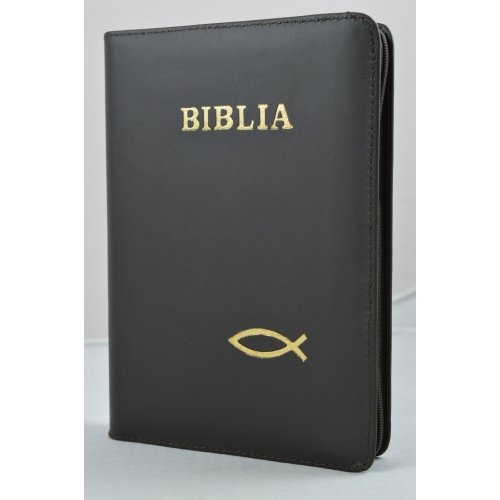 Biblia din piele, marime medie, maro inchis, fermoar, simbol peste, cuv. lui Isus cu rosu [053]