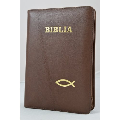 Biblia din piele, marime medie, maro inchis, fermoar, simbol peste, cuv. lui Isus cu rosu [053]