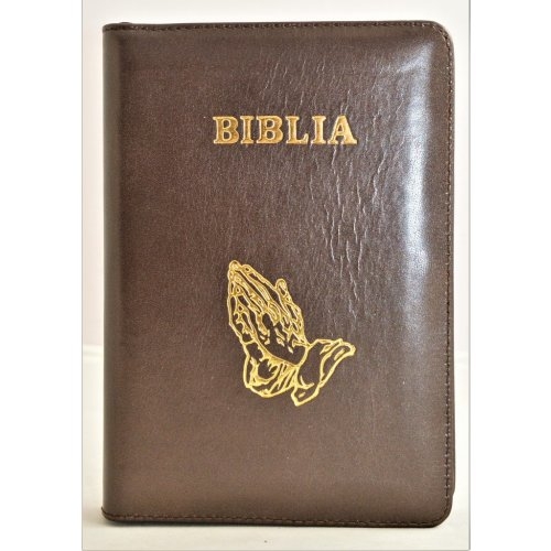Biblia din piele, marime medie, maro sidefat, fermoar, simbol maini in ruga, cuv. lui Isus cu rosu [053]
