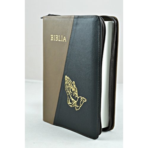 Biblia din piele, marime medie, maroniu cu negru, fermoar, simbol maini in rugaciune, cuv. lui Isus cu rosu [053]