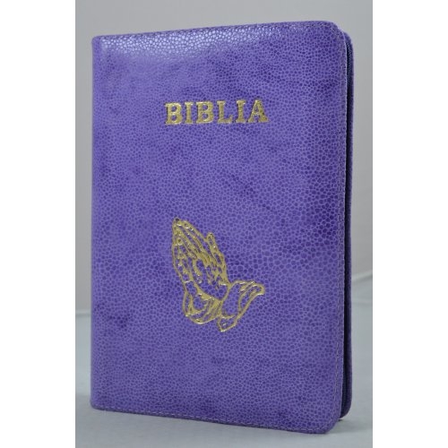 Biblia din piele, marime medie, mov, fermoar, simbol maini in rugaciune, cuv. lui Isus cu rosu [053]